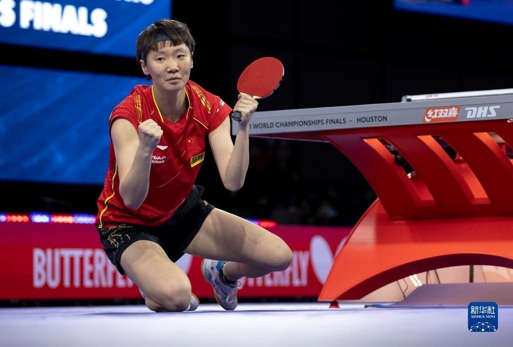 2021年11月29日,王曼昱慶祝奪冠。當(dāng)日,在美國休斯敦進(jìn)行的2021世界乒乓球錦標(biāo)賽女子單打決賽中,中國選手王曼昱以4:2戰(zhàn)勝隊(duì)友孫穎莎,奪得冠軍。 新華社瓦格納攝