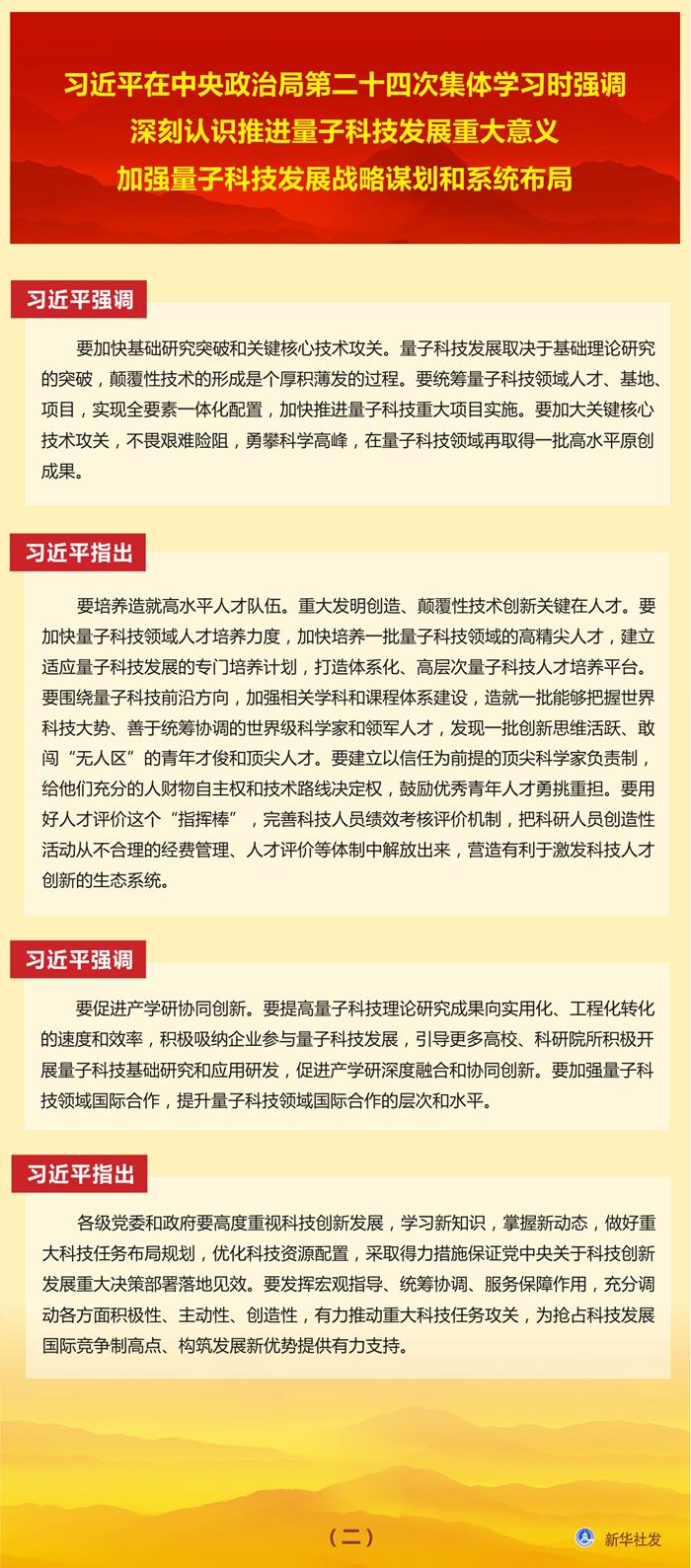 習(xí)近平在主持學(xué)習(xí)時(shí)發(fā)表了講話(huà)。他指出,近年來(lái),量子科技發(fā)展突飛猛進(jìn),成為新一輪科技革命和產(chǎn)業(yè)變革的前沿領(lǐng)域。加快發(fā)展量子科技,對(duì)促進(jìn)高質(zhì)量發(fā)展、保障國(guó)家安全具有非常重要的作用。安排這次集體學(xué)習(xí),目的是了解世界量子科技發(fā)展態(tài)勢(shì),分析我國(guó)量子科技發(fā)展形勢(shì),更好推進(jìn)我國(guó)量子科技發(fā)展。