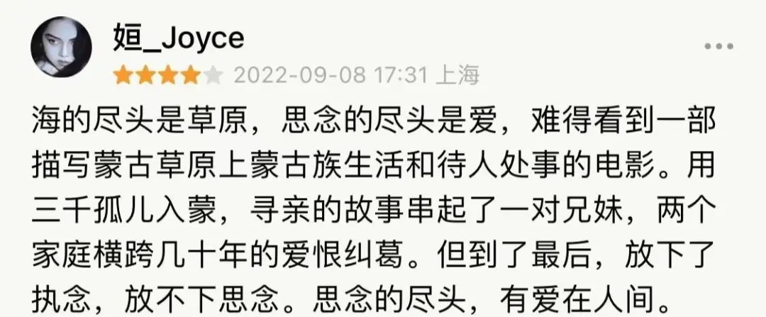 海的盡頭是草原,艱難的盡頭是大愛。新中國最難挺過的歲月里,一群脆弱的孤兒,被我們的同胞無私接納,用一生去守護(hù)。在這部真實(shí)歷史故事改編成的電影里,我們感受到的,是困厄也無法打敗的人性之光和人情溫暖。