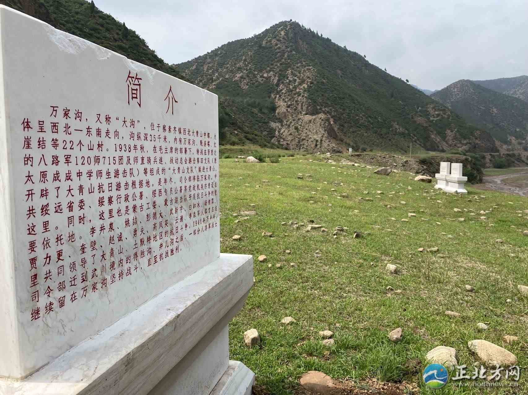 入溝不久,在綠草如茵的山坡上,就可以眺望到遠(yuǎn)處已經(jīng)廢棄的民房,有幾十年前的老房子,也有建筑時(shí)間不長(zhǎng)的,眼前的一切讓人恍惚,仿佛剛剛還在上演煙火氣息的鄉(xiāng)村生活。在這里矗立著寫有“萬家溝革命遺址”的漢白玉紀(jì)念碑,這是土左旗文物保護(hù)中心副主任高鷹和同事們半年前安放的。從這里,萬家溝革命遺址的探訪正式開始。