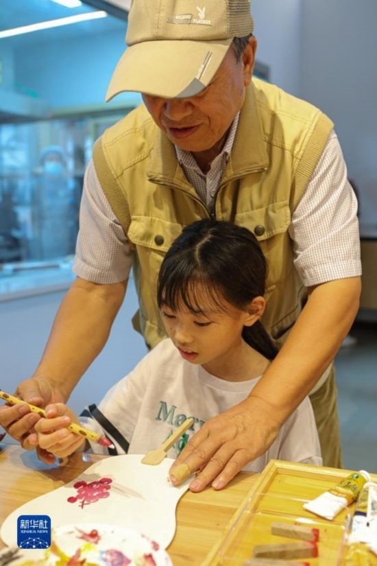 9月24日,在婁塘塌餅非遺傳承館,外國小朋友體驗畫扇面。