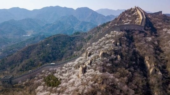 仲春時(shí)節(jié),八達(dá)嶺東段的水關(guān)長(zhǎng)城山花爛漫,自然與人文景觀(guān)交相輝映。(新華社發(fā)陳鐘昊 攝)