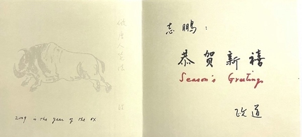 2009年為農歷已丑年,俗稱牛年。李政道在賀年卡上畫了一頭健壯的牛。這頭牛騰起四蹄,犄角對著前方,勇猛無比。淡淡的筆墨,精準的線條,黑白的布局,一頭開山牛躍然紙上。牛尾的右上部,他用鉛筆輕輕寫上了:“仿唐人筆法”。然后簽上了自己名字中的“政”字。