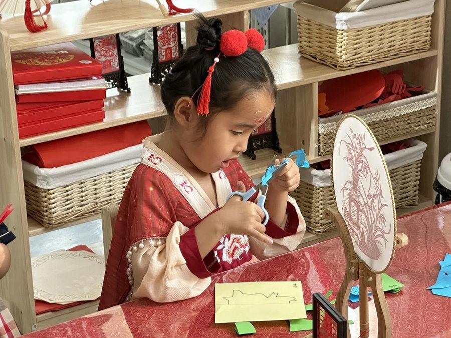 在剪紙區(qū),中大班的小朋友剪出了一張張漂亮的剪紙,把它們貼在了古色古香的扇子上,制作出了消暑清涼的扇子。