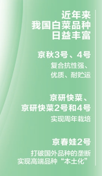 近年來,我國白菜育種實力突飛猛進,品種日益豐富,實現(xiàn)了從單一“秋播冬貯”向優(yōu)勢產區(qū)生產、產品多樣化和周年生產轉變。培育出了復合抗性強、優(yōu)質、耐貯運的品種“京秋3號、4號”等,高品質、速生苗用品種“京研快菜、京研快菜2號和4號”3個品種搭配實現(xiàn)了周年栽培,解決了生產上長期缺乏冬春和夏季栽培專用品種的難題。還育成了娃娃菜、快菜、紹菜、金絲白等高品質品種,尤其是“京春娃2號”一舉打破國外品種的壟斷,它比國外品種早熟5至7天,種植密度高25%,畝收入增長30%,已成為國產娃娃菜第一大品種,實現(xiàn)了高端品種的“本土化”。