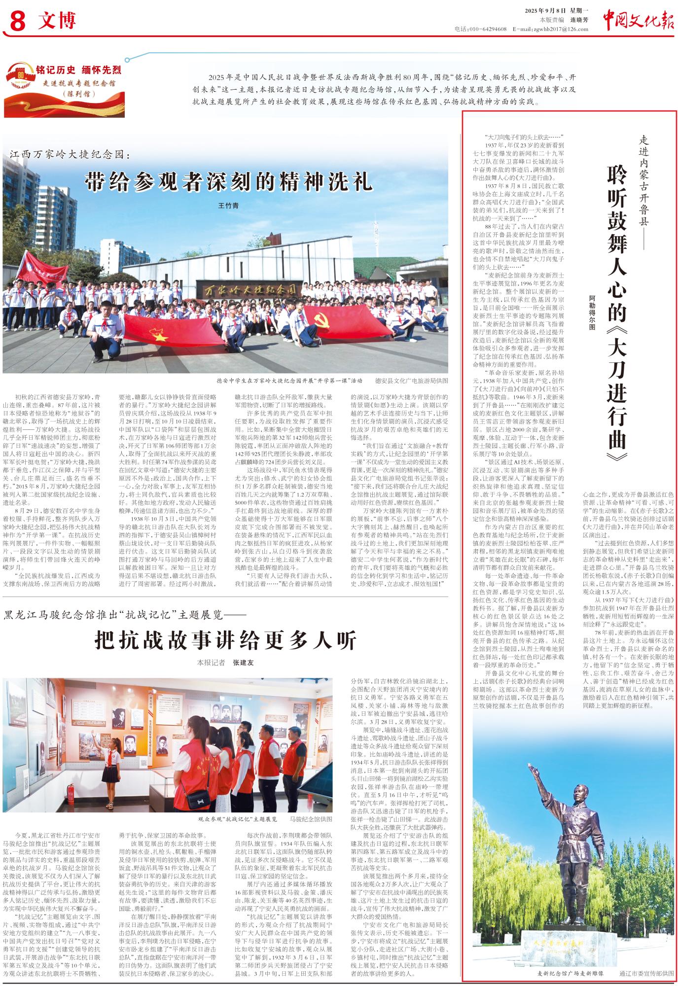 2025年9月8日,《中國文化報(bào)》第8版整版刊發(fā)題為《走進(jìn)內(nèi)蒙古開魯縣——聆聽鼓舞人心的《大刀進(jìn)行曲》》的文章,報(bào)道了內(nèi)蒙古開魯縣麥新紀(jì)念館以麥新的一生為主線,以傳承紅色基因?yàn)樽谥?,是目前全國唯一一所全面展示麥新烈士生平事跡的專題陳列展館。經(jīng)過提升改造后,麥新紀(jì)念館以全新的觀展體驗(yàn)吸引眾多參觀者,進(jìn)一步發(fā)揮了紀(jì)念館在傳承紅色基因、弘揚(yáng)革命精神方面的重要作用。