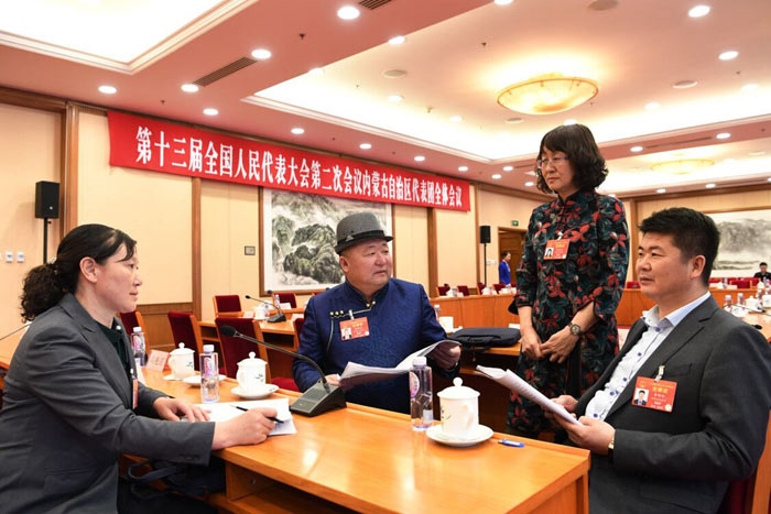 3月12日,內(nèi)蒙古代表團(tuán)的4名基層代表在全團(tuán)會議結(jié)束后,仍在熱議“兩高”報告。 內(nèi)蒙古日報社融媒體記者 袁永紅 攝