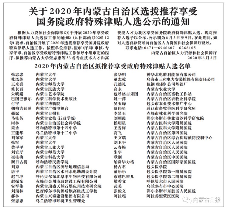 根據(jù)人力資源社會(huì)保障部《關(guān)于開(kāi)展2020年享受政府特殊津貼人員選拔工作的通知》(人社部函〔2020〕12號(hào))要求,自治區(qū)開(kāi)展了2020年選拔推薦享受國(guó)務(wù)院政府特殊津貼人選工作。按照單位推薦、盟市(廳局)審核、專家評(píng)審、自治區(qū)享受政府特殊津貼工作領(lǐng)導(dǎo)小組審定的程序,擬推薦內(nèi)蒙古大學(xué)張志忠等53名專業(yè)技術(shù)人才和高技能人才為我區(qū)享受國(guó)務(wù)院政府特殊津貼人選?,F(xiàn)對(duì)推薦人選予以公示,公示期為6月3日至9日,在此期間,如對(duì)人選有異議可向自治區(qū)人力資源和社會(huì)保障廳反映。