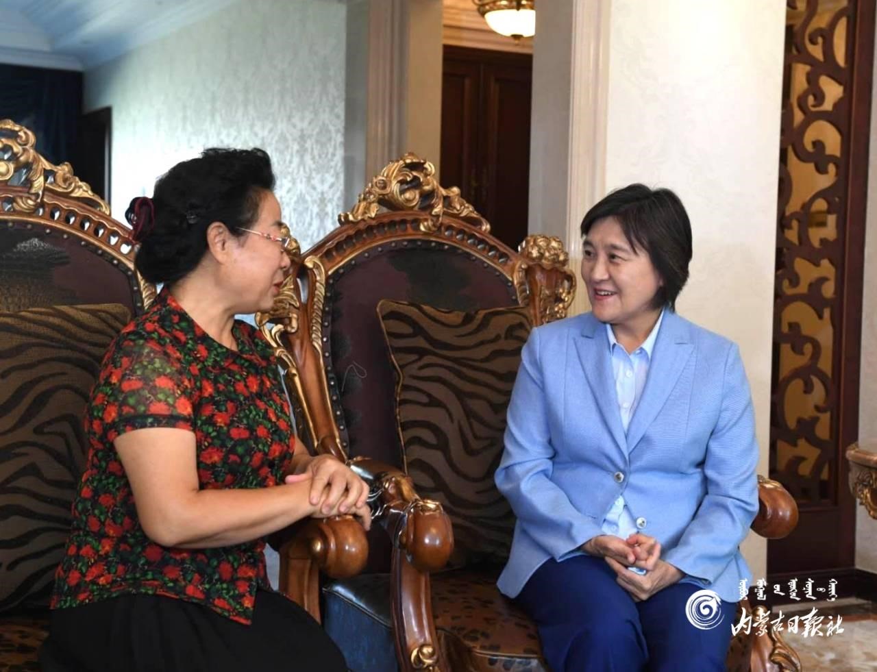 9月10日上午,自治區(qū)黨委副書記、自治區(qū)主席布小林慰問呼和浩特市第二中學(xué)退休教師姜超霞(右)。內(nèi)蒙古日?qǐng)?bào)社融媒體記者 韓卿立 攝