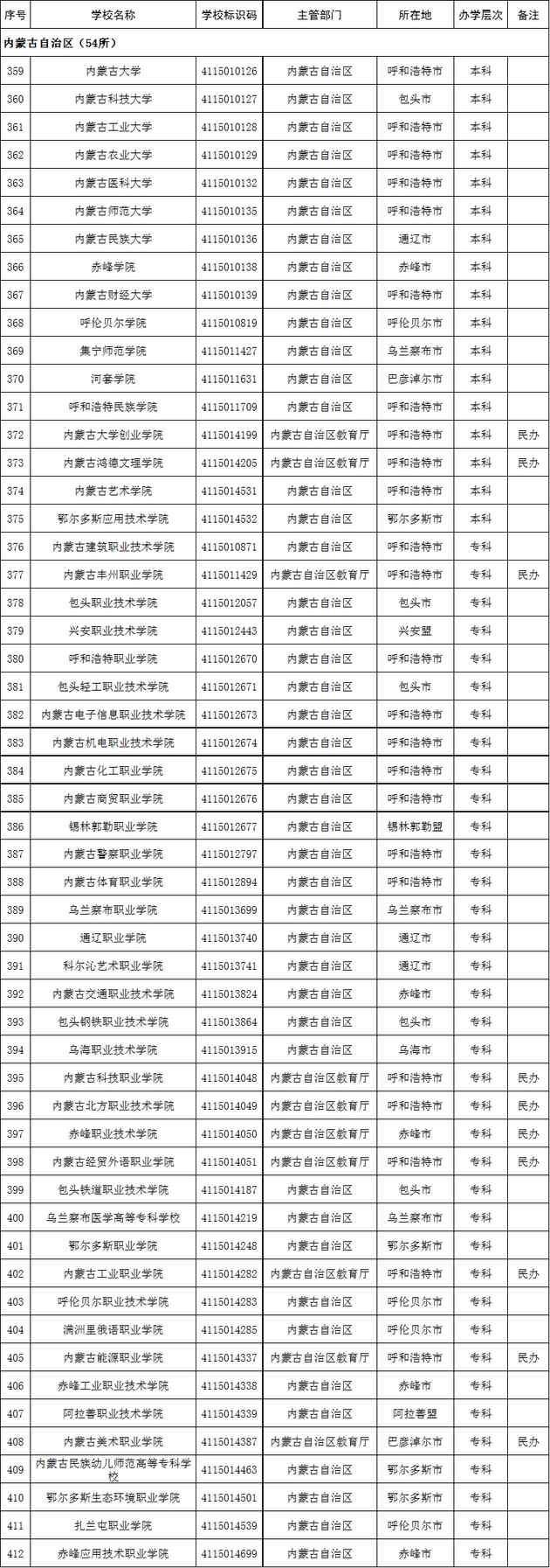 截至2020年6月30日,全國(guó)高等學(xué)校共計(jì)3005所,其中:普通高等學(xué)校2740所,含本科院校1258所、高職(專科)院校1482所;成人高等學(xué)校265所。本名單未包含港澳臺(tái)地區(qū)高等學(xué)校。以下為內(nèi)蒙古自治區(qū)2020年普通高等學(xué)校名單(54所)。