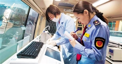 市場(chǎng)監(jiān)督管理局的檢測(cè)人員正在對(duì)食品進(jìn)行檢查。