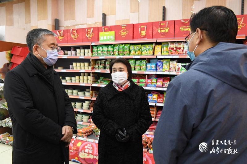 1月17日上午,自治區(qū)黨委副書記、自治區(qū)主席布小林在呼和浩特市維多利喜悅匯超市檢查生活物資供應(yīng)、食品安全和疫情防控情況。內(nèi)蒙古日報(bào)記者 韓卿立 攝