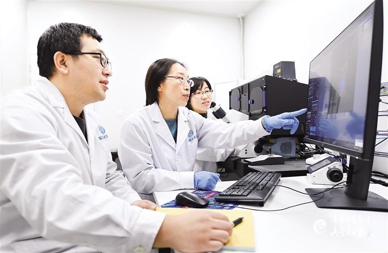 內(nèi)蒙古大學(xué)生命科學(xué)學(xué)院院長、省部共建草原家畜生殖調(diào)控與繁育國家重點(diǎn)實(shí)驗(yàn)室主任胡薇(中)與團(tuán)隊(duì)成員觀察動物的成纖維細(xì)胞結(jié)構(gòu)形態(tài)。內(nèi)蒙古日報社融媒體記者 王磊 攝