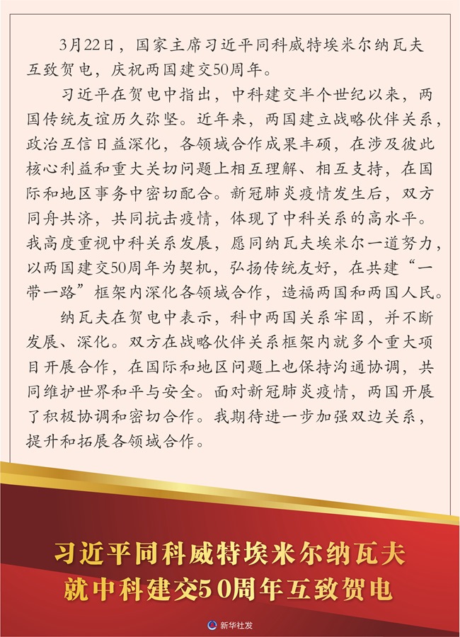 習(xí)近平在賀電中指出,中科建交半個世紀(jì)以來,兩國傳統(tǒng)友誼歷久彌堅。近年來,兩國建立戰(zhàn)略伙伴關(guān)系,政治互信日益深化,各領(lǐng)域合作成果豐碩,在涉及彼此核心利益和重大關(guān)切問題上相互理解、相互支持,在國際和地區(qū)事務(wù)中密切配合。新冠肺炎疫情發(fā)生后,雙方同舟共濟(jì),共同抗擊疫情,體現(xiàn)了中科關(guān)系的高水平。我高度重視中科關(guān)系發(fā)展,愿同納瓦夫埃米爾一道努力,以兩國建交50周年為契機(jī),弘揚(yáng)傳統(tǒng)友好,在共建“一帶一路”框架內(nèi)深化各領(lǐng)域合作,造福兩國和兩國人民。