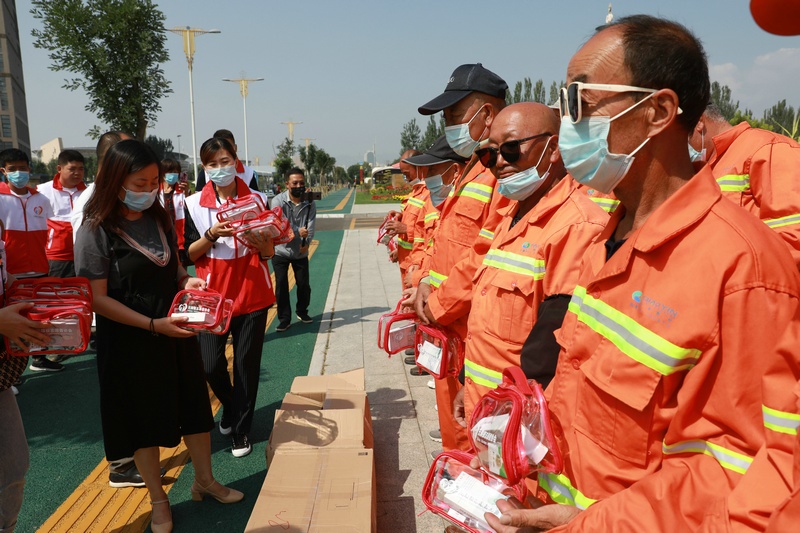 活動中,三家黨組織和志愿者們向呼和浩特僑銀城市管理有限公司、呼和浩特市回民區(qū)環(huán)境衛(wèi)生服務中心的環(huán)衛(wèi)工人共捐贈夏日清涼包200套。