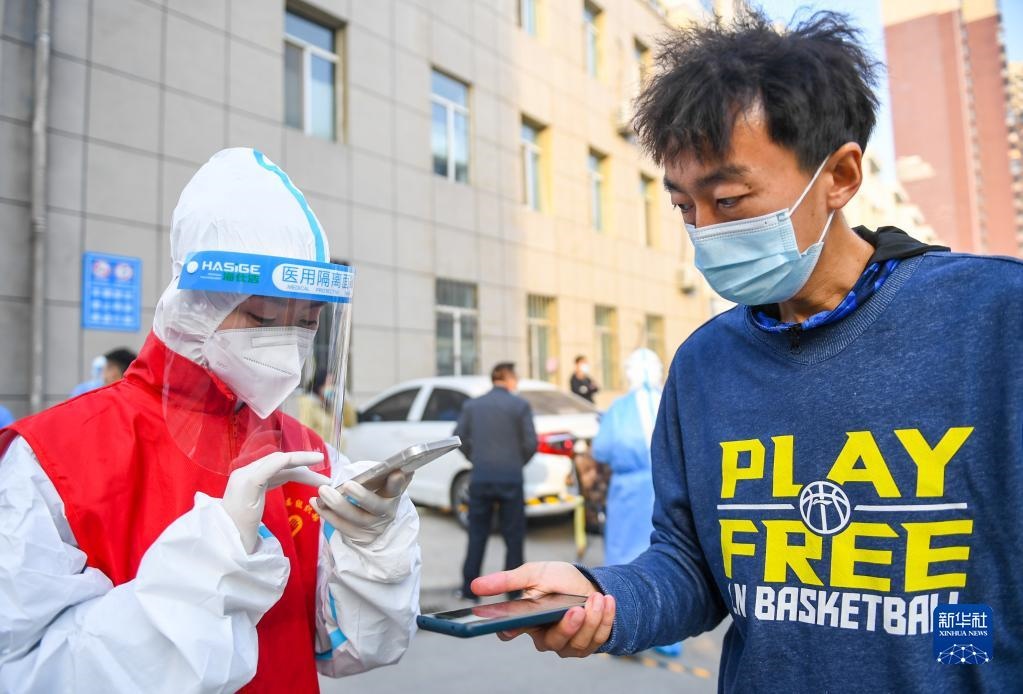 10月25日,在呼和浩特市賽罕區(qū)昭烏達(dá)南路街道惠民社區(qū)核酸檢測(cè)點(diǎn),志愿者為居民掃碼登記信息。