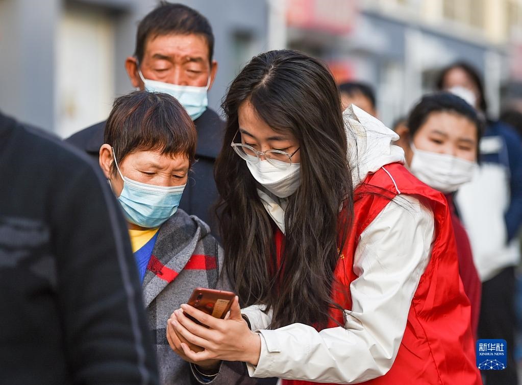 10月25日,在呼和浩特市賽罕區(qū)昭烏達(dá)南路街道惠民社區(qū)核酸檢測(cè)點(diǎn),志愿者幫助居民用手機(jī)登記個(gè)人信息。