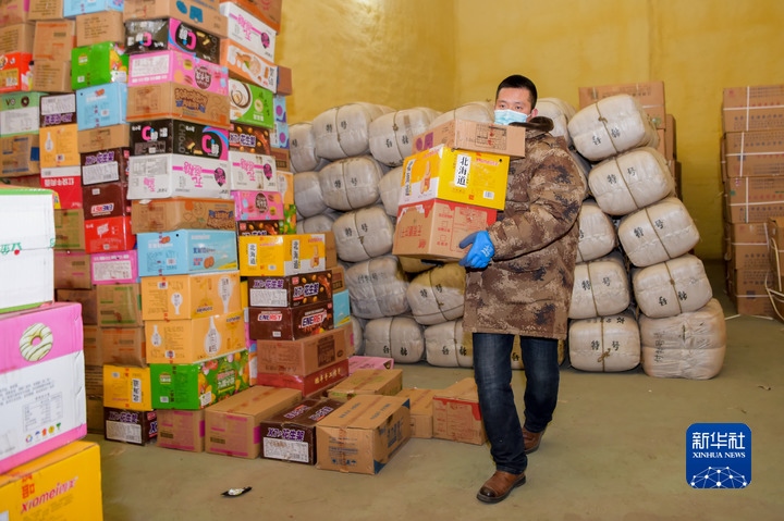 127日,在滿洲里市一物資儲(chǔ)備庫(kù),工作人員王永亮在搬運(yùn)物資。新華社記者魏婧宇 攝