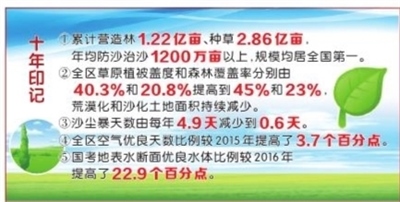 累計營造林1.22億畝、種草2.86億畝,年均防沙治沙1200萬畝以上,規(guī)模均居全國第一;全區(qū)草原植被蓋度和森林覆蓋率分別由40.3%和20.8%提高到45%和23%,荒漠化和沙化土地面積持續(xù)減少;全區(qū)空氣優(yōu)良天數(shù)比例較2015年提高3.7個百分點(diǎn),國考地表水?dāng)嗝鎯?yōu)良水體比例較2016年提高22.9個百分點(diǎn)……