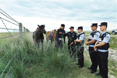 (題圖:護(hù)邊員和邊境派出所民警觀察邊境情況。記者 馬建荃 攝)