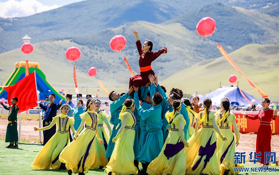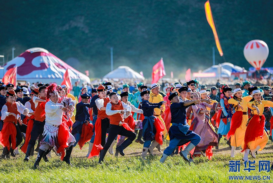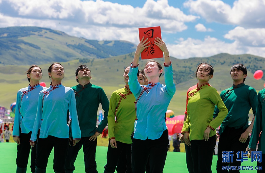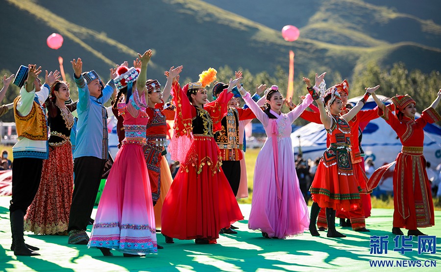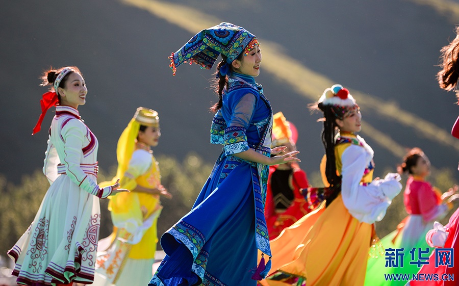 8月8日,烏蘭牧騎隊(duì)員們?cè)陂_幕式上進(jìn)行文藝表演。新華網(wǎng)發(fā)(丁根厚攝)