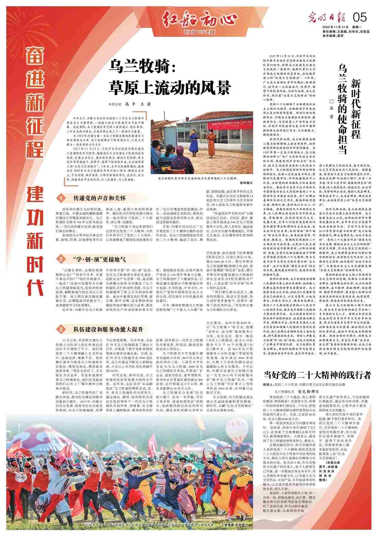 2017年11月21日,習近平總書記給蘇尼特右旗烏蘭牧騎的隊員們回信,勉勵他們大力弘揚烏蘭牧騎的優(yōu)良傳統(tǒng),扎根生活沃土,服務牧民群眾,推動文藝創(chuàng)新,努力創(chuàng)作更多接地氣、傳得開、留得下的優(yōu)秀作品,永遠做草原上的“紅色文藝輕騎兵”。5年來,總書記的殷殷囑托,激勵全區(qū)3500多名烏蘭牧騎隊員牢記初心使命、根植生活沃土,守正創(chuàng)新、踔厲奮發(fā),不斷創(chuàng)新服務形式,送歡樂、送文明,傳遞黨的聲音和關懷,為人民服務、為人民放歌。