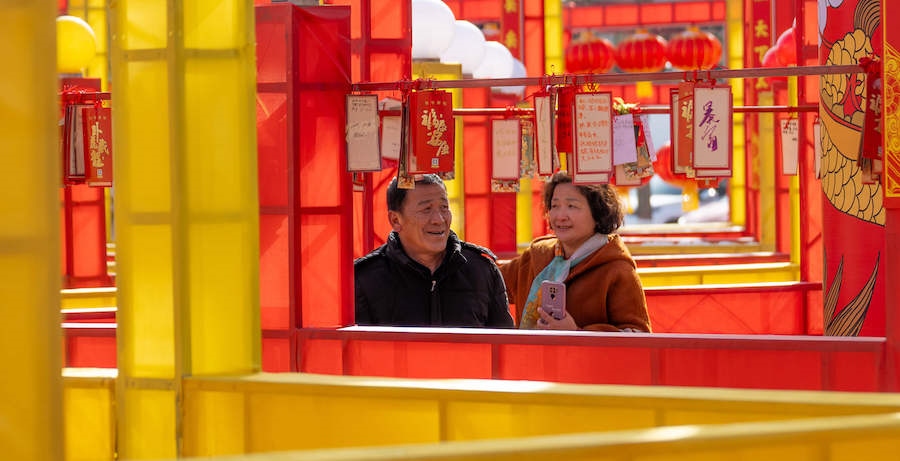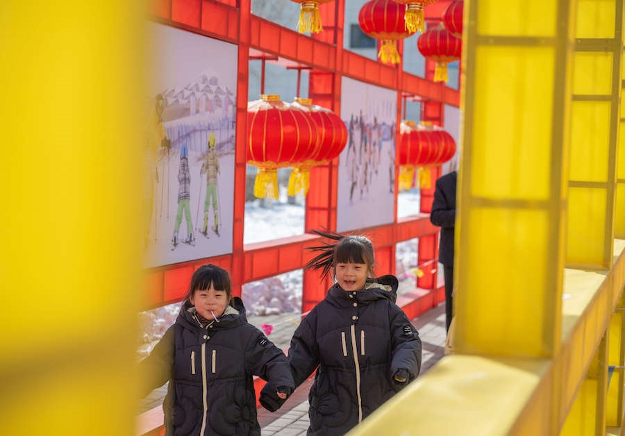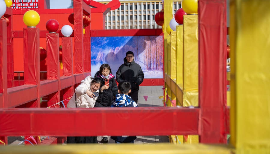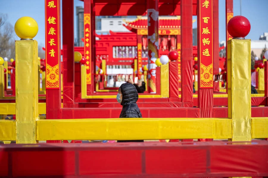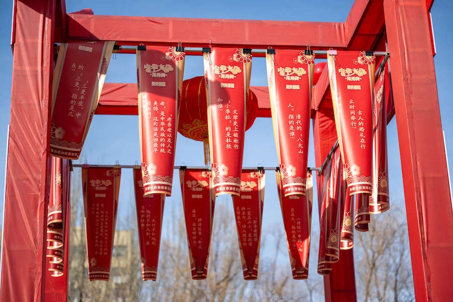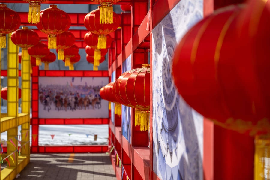 在內(nèi)蒙古展覽館的九曲陣中設(shè)有八個關(guān)口,每個關(guān)口懸掛著印有感黨恩、北疆文化、冰雪旅游、中華詩詞、傳統(tǒng)年俗等有關(guān)的知識問答彩旗。