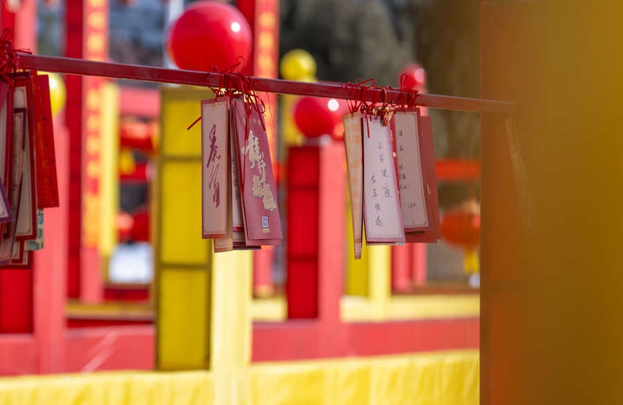 在九曲中,有九道門,其中八道門可以猜燈謎,猜對后換一張祈福卡來到吉祥門進行許愿祈福。