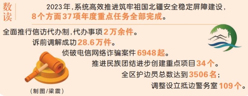 ——制定自治區(qū)本級專項應急預案47項,深入開展重大事故隱患專項排查整治2023行動,排查整改問題隱患48.76萬項。全面推行信訪代辦制,代辦事項2萬余件,初次信訪事項一次性化解率達到97%。深化訴源治理,建立“一站式”矛盾調(diào)解中心1094個,訴前調(diào)解成功28.6萬件。常態(tài)化開展掃黑除惡斗爭,嚴厲打擊各類違法犯罪活動,偵破電信網(wǎng)絡詐騙案件6948起,命案現(xiàn)案全破并破獲積案82起。