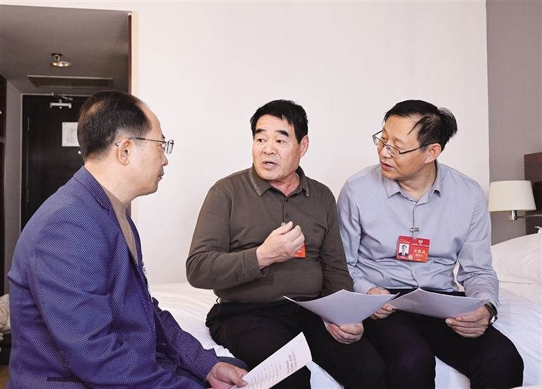 3月4日,住我區(qū)全國政協(xié)委員阿拉騰達來(左)、廷·巴特爾(中)、曹金山(右)在住地,就進一步提高草原生態(tài)保護補助獎勵標準,為打贏“三北”工程攻堅戰(zhàn)和三大標志性戰(zhàn)役奠定政策基礎的提案進行討論。草原全媒·內蒙古新聞網(wǎng)記者 韓卿立 攝