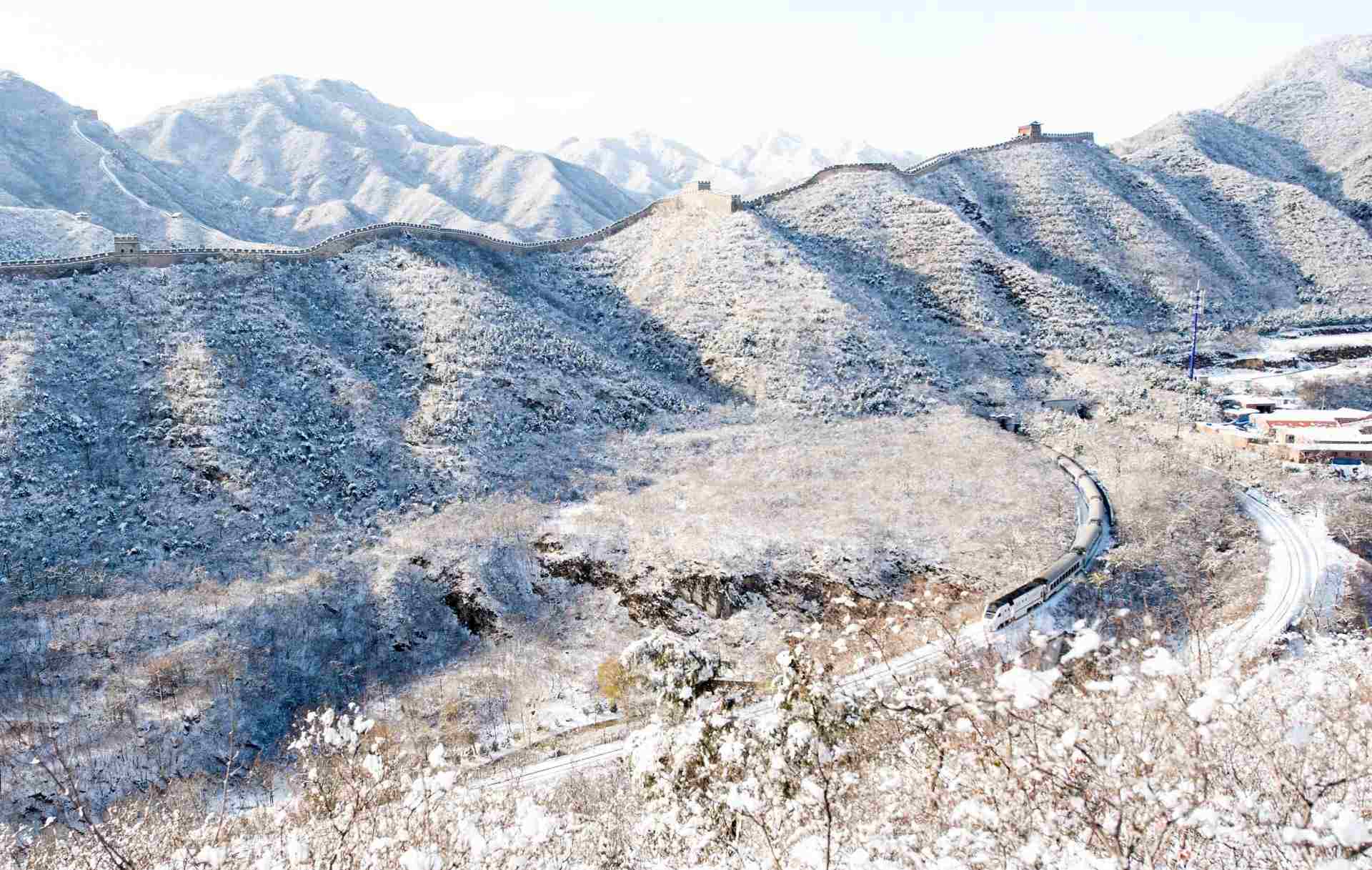 白雪皚皚,北京居庸關(guān)長城銀裝素裹綿延于山脊之上。山腳下,S2線列車迎面而來穿越雪海。