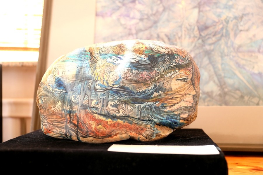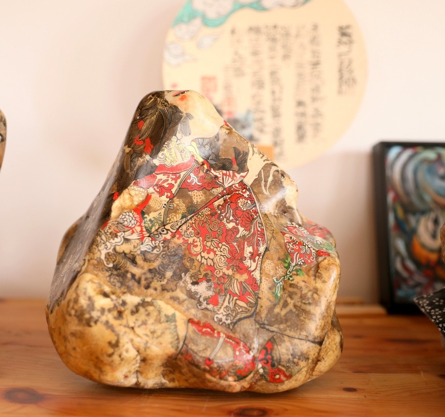 魯婷介紹她創(chuàng)作的石畫(huà)作品
