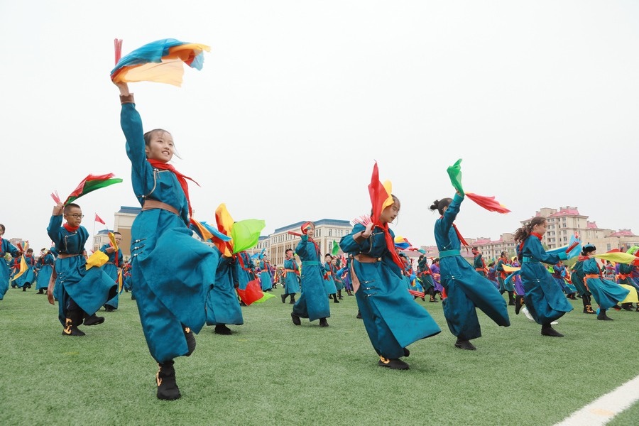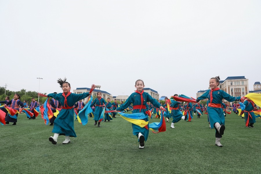 北疆新聞鄂爾多斯5月29日電(記者 張楊)“我們以鑄牢中華民族共同體意識為主線,創(chuàng)建了4個‘千人文化’特色課程,分別為千人足球、千人《江格爾》、千人筷子舞、千人棋類。”5月29日,內(nèi)蒙古鄂爾多斯鄂托克前旗“美育潤心·筑夢同行”第十四屆中小學師生藝術(shù)節(jié)暨慶“六一”國際兒童節(jié)多彩大課間操展示活動,在鄂托克前旗第一小學舉行。該校校長阿拉騰達來接受記者采訪時表示,創(chuàng)建這個特色課程的主要目的,是培養(yǎng)孩子多方面的才藝,為祖國培養(yǎng)有用之才。