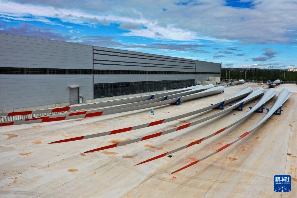 ??這是9月20日拍攝的位于鄂爾多斯市的株洲時(shí)代新材料科技股份有限公司蒙西分公司內(nèi)的風(fēng)機(jī)葉片(無(wú)人機(jī)照片)。