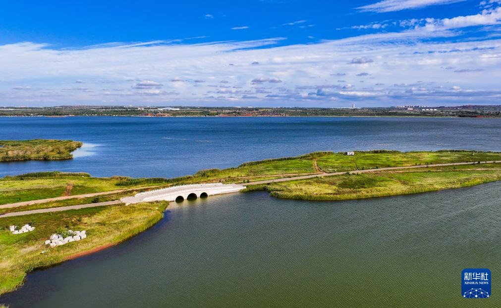 ??這是9月19日拍攝的鄂爾多斯市康巴什區(qū)烏蘭木倫湖與百康橋(無(wú)人機(jī)照片)。