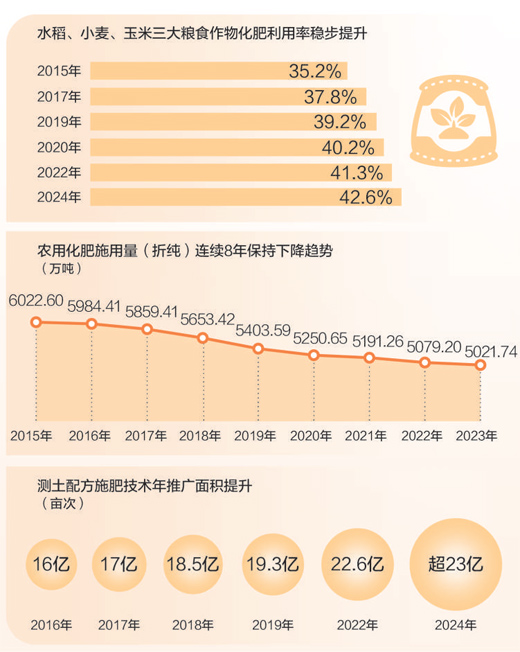 2024年,我國(guó)水稻、小麥、玉米三大糧食作物化肥利用率為42.6%,比2022年提高1.3個(gè)百分點(diǎn)?;世寐剩椿时蛔魑镂绽玫谋壤?,反映了化肥在農(nóng)業(yè)生產(chǎn)中的有效利用程度??茖W(xué)施肥效果提升,折射農(nóng)業(yè)發(fā)展方式之變。