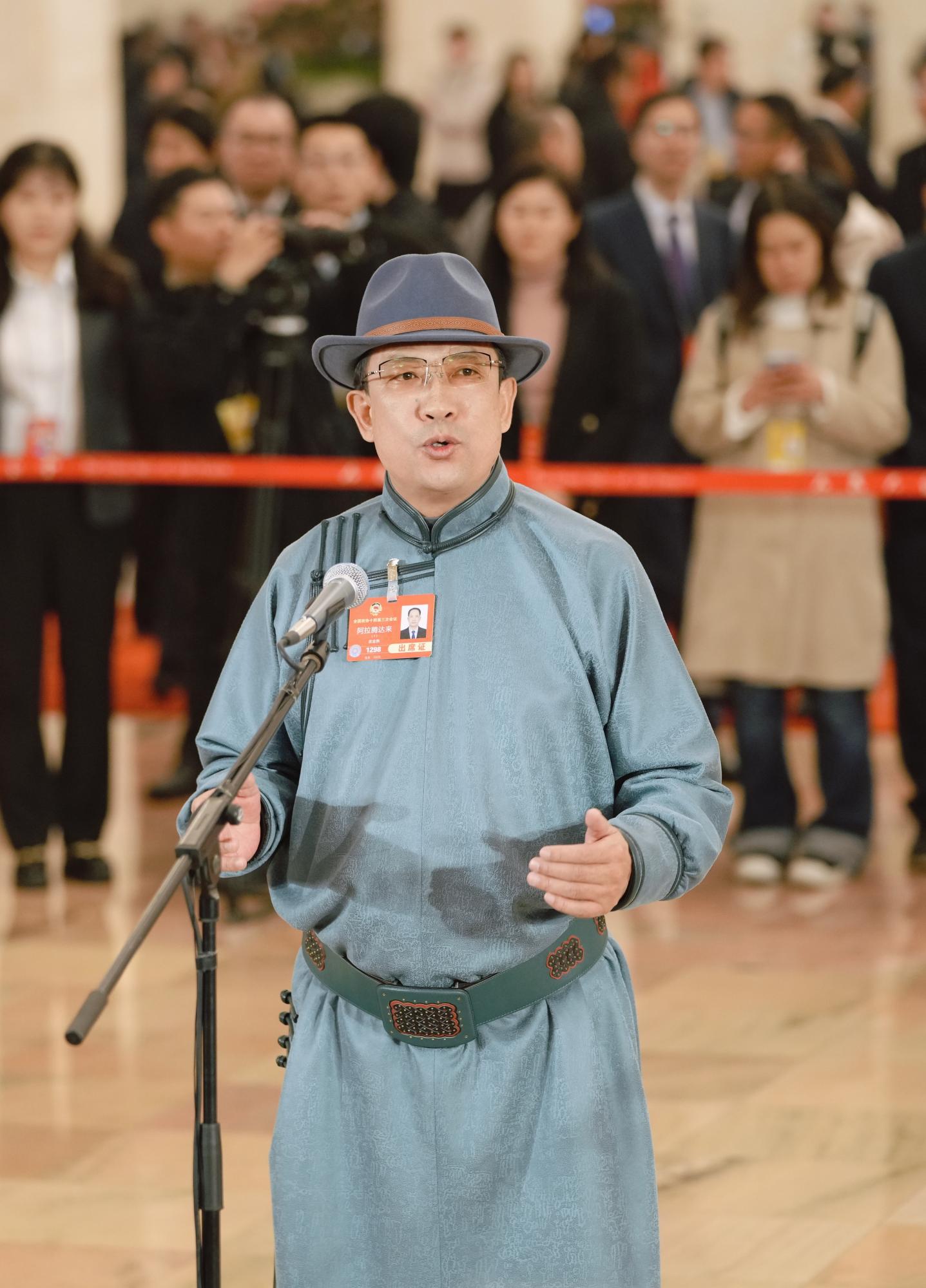 3月10日,全國政協(xié)十四屆三次會議第三場“委員通道”集體采訪活動在北京人民大會堂舉行。住內蒙古全國政協(xié)委員阿拉騰達來接受媒體采訪。草原云記者 王鵬 攝