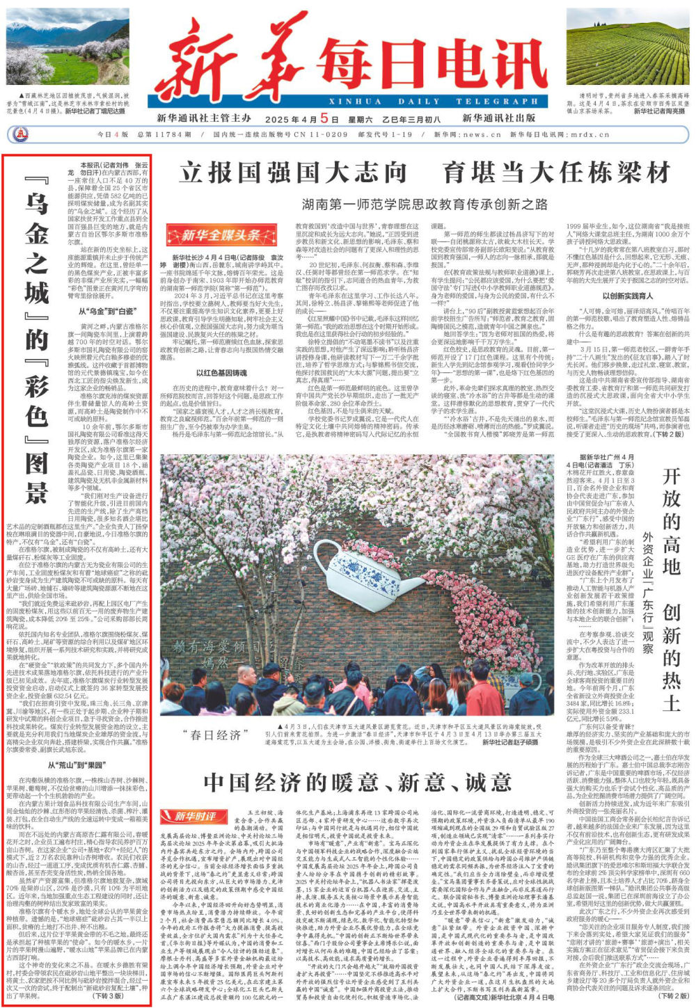 2025年4月5日,《新華每日電訊》第1版刊發(fā)題為《“烏金之城”的“彩色”圖景》的文章,報道了內(nèi)蒙古自治區(qū)鄂爾多斯市準(zhǔn)格爾旗,這座能源重鎮(zhèn)并未止步于傳統(tǒng)產(chǎn)業(yè)的輝煌。在這里,曾經(jīng)單一的黑色煤炭產(chǎn)業(yè),正被豐富多彩的非煤產(chǎn)業(yè)所充實,一幅幅“彩色”圖景正在黃河幾字彎的臂彎里徐徐展開。