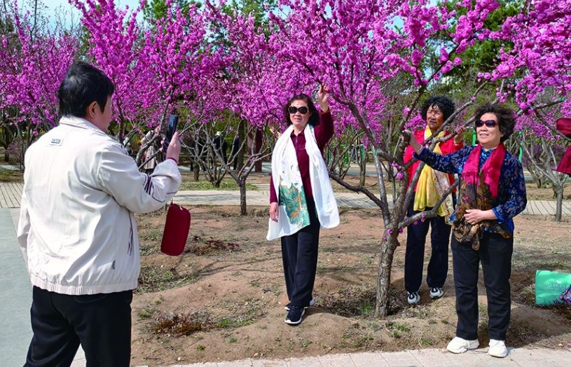 走進(jìn)植物園,道路兩側(cè)的榆葉梅競相綻放,粉紅色的花朵層層疊疊掛滿枝頭,形成一片爛漫花海。從浙江來的游客李筱正用手機(jī)記錄美景:“原本擔(dān)心錯過北方花期,沒想到這里的榆葉梅開得這么漂亮,完全不輸江南的春天?!?/p>