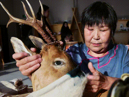 在鄂倫春自治旗文化館,一場(chǎng)小型非物質(zhì)文化遺產(chǎn)代表性項(xiàng)目展示活動(dòng)正在進(jìn)行?!岸鮽惔横蠼敲敝谱骷妓嚒钡淖灾螀^(qū)級(jí)非物質(zhì)文化遺產(chǎn)代表性傳承人吳玲芝,用獸皮制作的鄂倫春族傳統(tǒng)長(zhǎng)袍,是名副其實(shí)的“高奢定制服裝”。