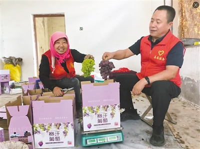 時(shí)任賽汗烏素村第一書記孫壽峰(右)幫助村民銷售葡萄。