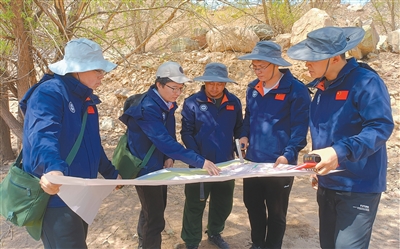 楊彪(左二)與團(tuán)隊(duì)工作人員在分析礦脈走向。孫濤 攝(人民視覺(jué))