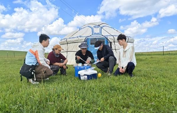 馬騰帶領(lǐng)團(tuán)隊(duì)在內(nèi)蒙古錫林郭勒大草原采集自然發(fā)酵乳。左三為馬騰。受訪者供圖
