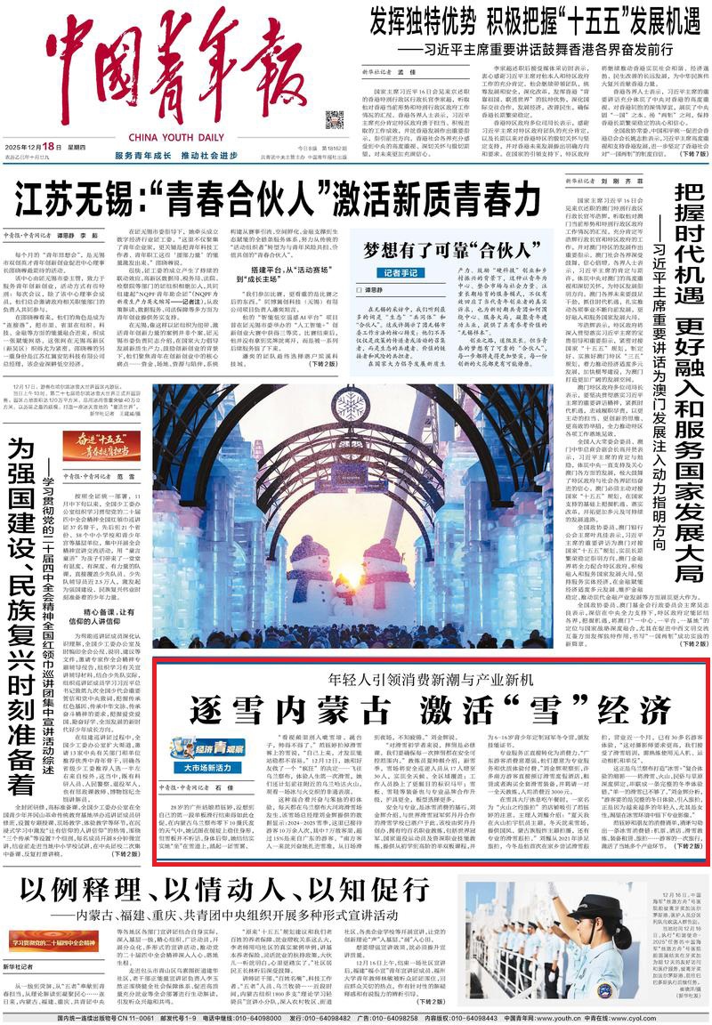 2025年12月18日《中國青年報》第1版刊發(fā)了《大市場新活力 年輕人引領(lǐng)消費(fèi)新潮與產(chǎn)業(yè)新機(jī) 逐雪內(nèi)蒙古 激活“雪”經(jīng)濟(jì)》的文章,報道了烏蘭察布大河灣滑雪場是打造“冰雪+”復(fù)合體驗(yàn)的縮影——將滑雪、火山、民俗與草原深度綁定,串聯(lián)成一條完整的冬季體驗(yàn)鏈。