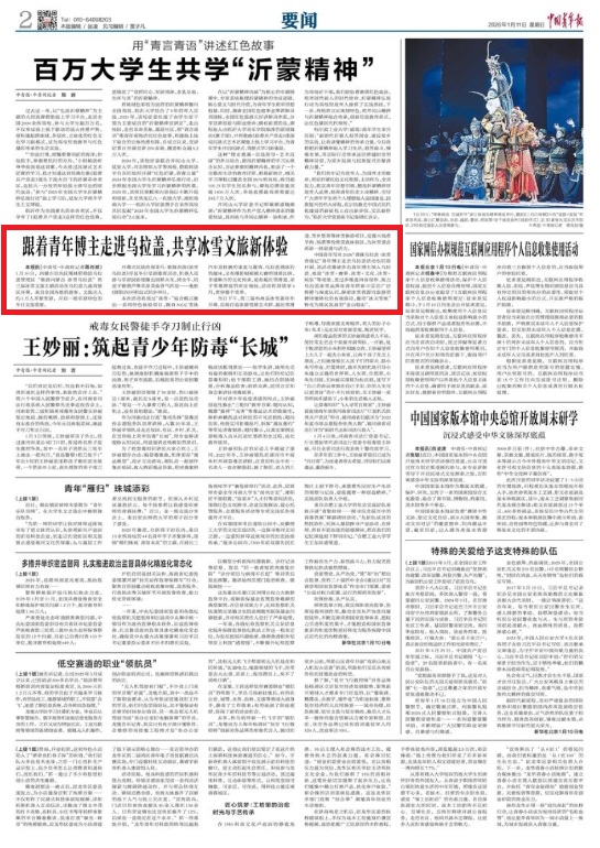 2026年1月11日,《中國青年報》第2版刊發(fā)題為《跟著青年博主走進(jìn)烏拉蓋,共享冰雪文旅新體驗(yàn)》的文章,報道了1月10日,內(nèi)蒙古自治區(qū)錫林郭勒盟烏拉蓋管理區(qū)“歌游內(nèi)蒙古 冰雪烏拉蓋”第三屆冰雪文旅主題活動在烏拉蓋九曲灣景區(qū)開幕。來自全國各地的游客、文旅達(dá)人約1萬人齊聚雪原,開啟一場草原特色的冬日文旅盛宴。