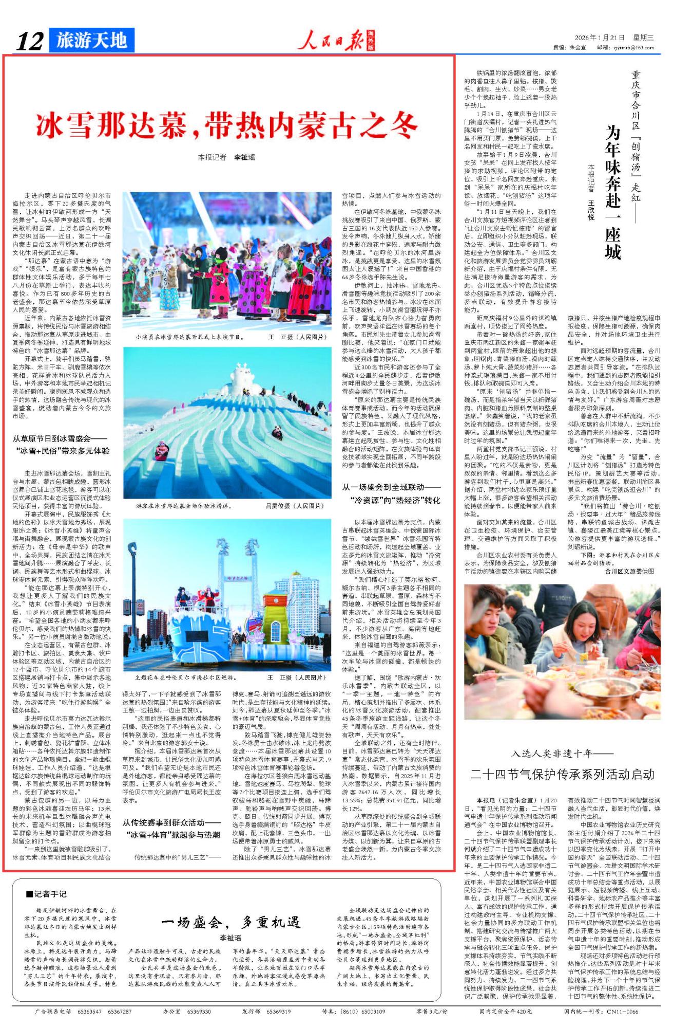 2026年1月21日《人民日?qǐng)?bào)海外版》第12版刊發(fā)了《冰雪那達(dá)慕,帶熱內(nèi)蒙古之冬》的文章,報(bào)道了近年來(lái),內(nèi)蒙古各地依托冰雪資源稟賦,將傳統(tǒng)民俗與冰雪旅游相結(jié)合,推動(dòng)那達(dá)慕從草原走進(jìn)城市、由夏季向冬季延伸,打造具有鮮明地域特色的“冰雪那達(dá)慕”品牌,為內(nèi)蒙古冬季文旅注入新活力。