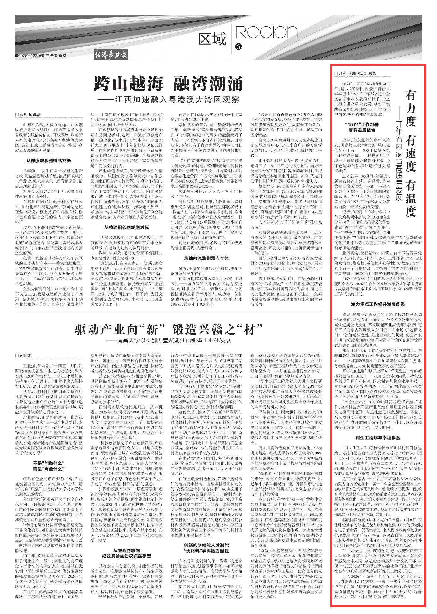 2026年1月28日《經濟參考報》第6版刊發(fā)了《有力度 有速度 有溫度——開年看內蒙古高質量發(fā)展》的文章,報道了進入2026年,站在“十五五”開局之年的起點上,內蒙古自治區(qū)黨委十一屆十一次全會暨全區(qū)經濟工作會議已擂響前進戰(zhàn)鼓:銳意進取,攻堅克難,高質量做好各項工作,確?!笆逦濉遍_好局、起好步,奮力書寫中國式現代化內蒙古新篇章。