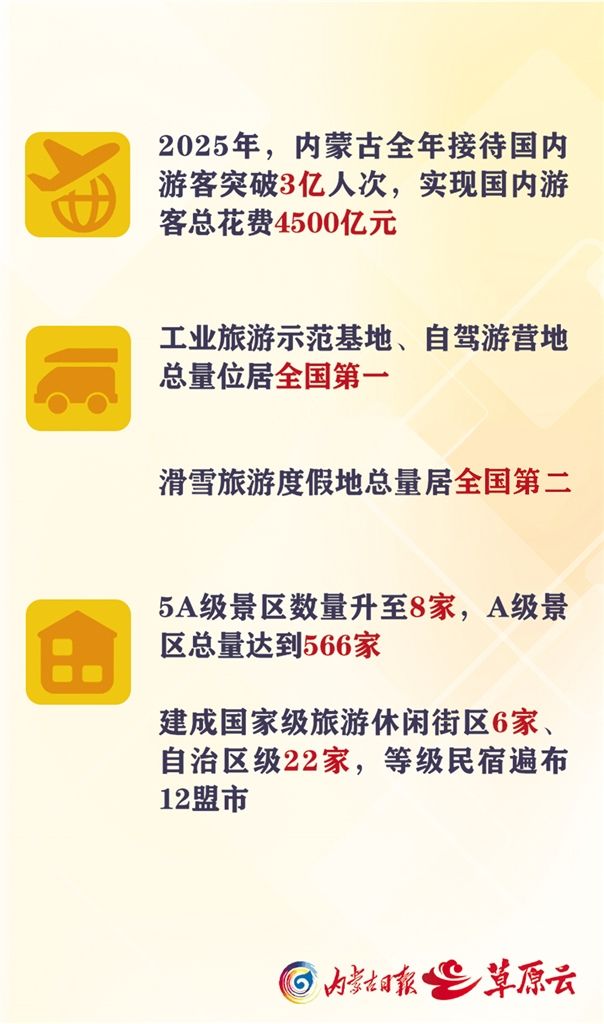 數(shù)據(jù)說(shuō)話,最有分量。2025年,內(nèi)蒙古全年接待國(guó)內(nèi)游客突破3億人次,實(shí)現(xiàn)國(guó)內(nèi)游客總花費(fèi)4500億元。