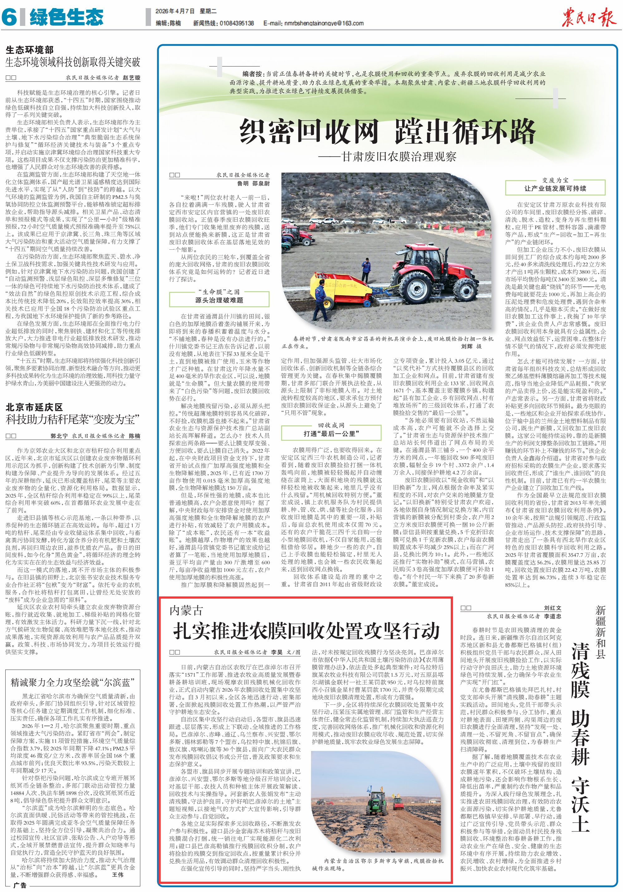 2026年4月7日,《農(nóng)民日報(bào)》第6版刊發(fā)題為《內(nèi)蒙古扎實(shí)推進(jìn)農(nóng)膜回收處置攻堅(jiān)行動(dòng)》的文章,報(bào)道了日前,內(nèi)蒙古自治區(qū)農(nóng)牧廳在巴彥淖爾市召開落實(shí)“1571”工作部署、推進(jìn)農(nóng)牧業(yè)高質(zhì)量發(fā)展暨春耕備耕培訓(xùn)班,現(xiàn)場觀摩農(nóng)田殘膜機(jī)械化回收作業(yè),正式啟動(dòng)內(nèi)蒙古2026年農(nóng)膜回收處置集中攻堅(jiān)行動(dòng)。自3月初以來,全區(qū)各地迅速行動(dòng)、密集部署,全面掀起殘膜回收處置工作熱潮,以嚴(yán)管嚴(yán)治守護(hù)耕地生態(tài)安全。