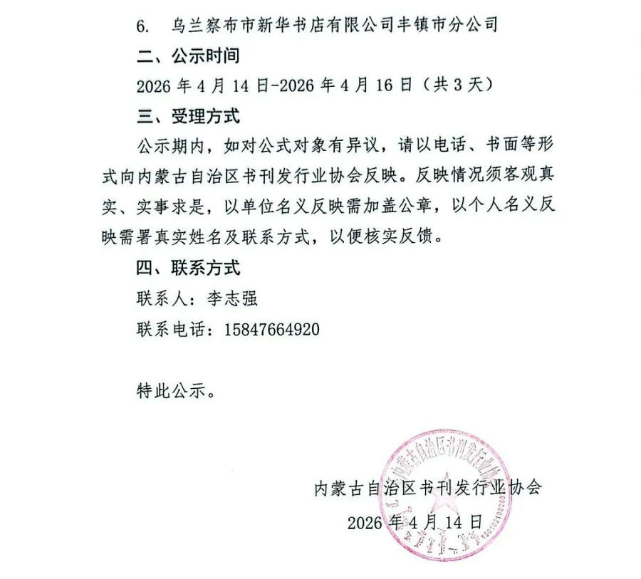 公示期內,如對公式對象有異議,請以電話、書面等形式向內蒙古自治區(qū)書刊發(fā)行業(yè)協(xié)會反映。反映情況須客觀真實、實事求是,以單位名義反映需加蓋公章,以個人名義反映需署真實姓名及聯(lián)系方式,以便核實反饋。